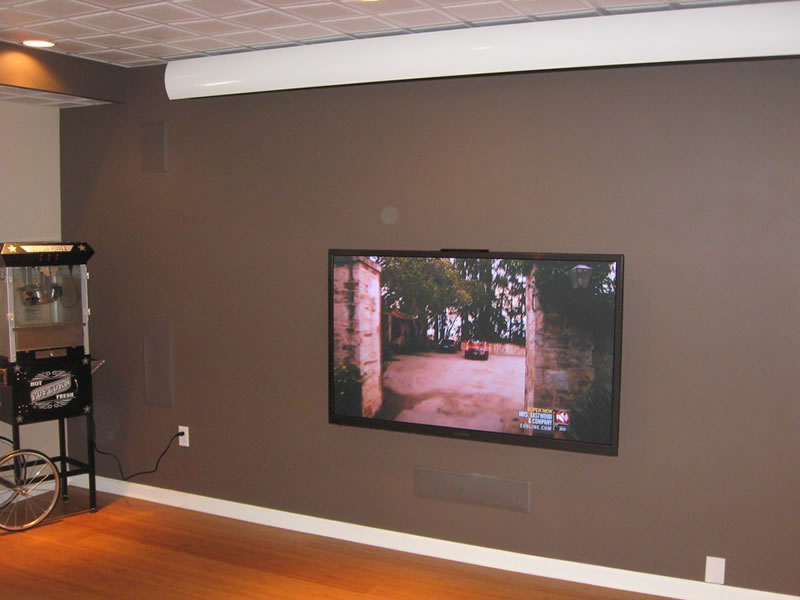 Incredibly sounding yet very affordable Paradigm in wall speakers were custom painted to match the forward wall. There are 5 speakers in the front wall (left, right, center, left height, right height) and a floor standing sub. A pair of two channel (stereo in one device) speakers are in the side walls adjacent to the main seating area and add significantly to the sense of envelopment placing you within the movie's action. Similar to the Enveloping Sound Experience Room this Man Cave features a 65inch plasma for Wii gaming and sports viewing as well as a movie screen. Note the pop-corn machine in the corner.