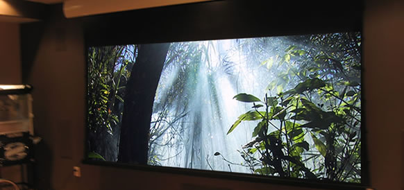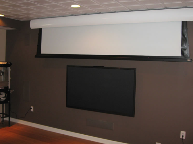 An awesome 125inch Cinemascope (wide screen) automatically drops from its attractive curved covering. The family enjoys films in their native movie-house format as well as TV in 16:9 (HDTV ratio) without the expense of an anamorphic lens utilizing a modern projector's lens memory feature.